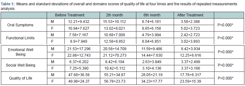 For statistical analysis, the data from those 71 patients who completed questionnaires at all time points were examined. To compare the relative changes of OHRQoL among different time points repeated measurement test was used and in order to evaluate the differences between the expected quality of life of treatment (before treatment) and the real quality of life after treatment of patients independent t test was used.