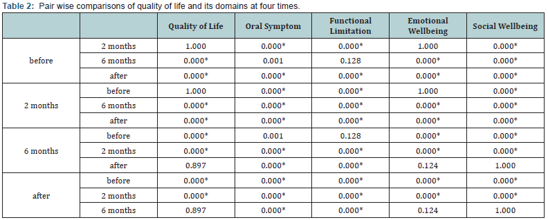 Comparing the T2 phase with T1, we found a significant decrease of the OHRQoL scores and its domains. Moreover, at the T2 phase the scores of the domains were lower than their equivalents at the T0 phase, and in the (oral symptoms, social wellbeing, and emotional wellbeing domains) these differences were significant. At T3 (after the treatment) the scores of OHRQoL and its domains decreased significantly in comparison of T0. In addition, the scores of oral symptoms and functional limitation domains at T3 compared with T2 decreased significantly. However, the score of social wellbeing domain increased from T2 to T3, but this increase was not significant (Table 2).