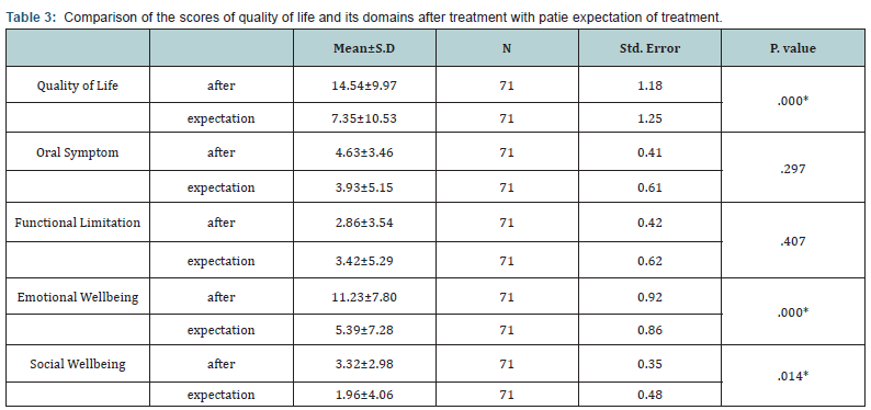 For comparison the expected quality of life of treatment (before treatment) and the real quality of life after treatment of patients independent t test was used that its results were shown in Table 3. According to this table, there were significant differences between expected quality of life and emotional and social wellbeing domains and their corresponding after treatment (P. value=.000, .000, .014 respectively). The level of expected OHRQoL and its domain were higher than those after treatment.