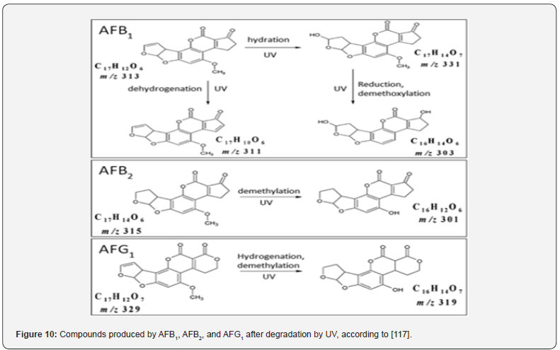 Numerous studies have revealed that physical strategies implemented after harvest are effective in reducing AF levels. For example, [46] reported that hand sorting by visible fungi infection is very efficient to decrease the AFB1 concentration of corn. Nevertheless, this approach is only applicable on an industrial scale using optical sorting equipment. Hulling of corn removes more than 90% of the AFs content, and rice polishing is a recommendable process [47,48]. The degradation of AFs requires high temperatures ranging from 237 to 306°C. According to reports, to achieve partial elimination of the toxins, temperatures must be above 150°C. Most industrial processes do not detoxify AFs, so there must be detection of AFs in final products. However, rice contaminated with AFB1 after cooking has shown a reduction of 34% that increased to 88% with pressure-cooking [49]. Sorting of grains leads to a decrease in AFs levels as clean grains are physically separated from contaminated ones. Nevertheless, this method is not very practical due to the incomplete removal of AFstainted grains Schaarschmidt and [50]. Milling of contaminated grain with AFs leads to the redistribution of toxin in certain mill fractions without destroying it [51]. Irradiation, including gamma, ultraviolet (UV), and electron beams, for contaminated grain is considered an effective method for the degradation of aflatoxins based on some factors like the dose and treatment time. According to [52], gamma (γ) is the most preferred radiation source for treating food with doses up to 10 kGy. On the other hand, UV irradiation is highly cost-effective and eco-friendly. Treatment of grains with moderate doses has no negative impact on their sensory and physicochemical properties. Many studies showed that UV treatment was effective. Most studies reported that the sensitivity of aflatoxins to UV was AFB1 > AFG1 > AFB2 [53]. Treatment of AFs leads to the appearance of several degraded products, as shown in (Figure 10).