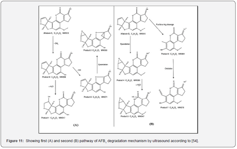 The application of ultrasound for the reduction or degradation of aflatoxins in grains is a promising technology because of its minimal impact on the physicochemical properties of foods. It also produces no secondary pollutants, so it is an eco-friendly and non-polluting technique. AFB1 degraded by ultrasound by affecting the chemically stable furan moiety and by changing the lactone ring in the main structure of AFB1 as shown (Figure 11 A &B) [54,55].