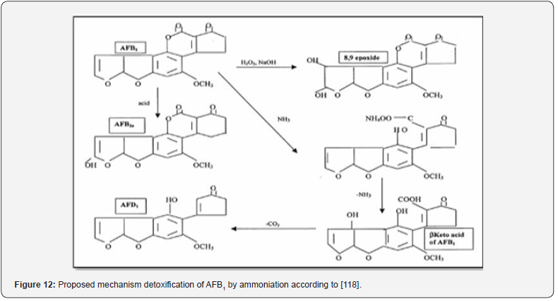 Ammoniation was one of the degradation methods for aflatoxins in the past, which used NH4OH or NH3. It can be utilized in two ways: as a high-pressure and high-temperature process or as an atmospheric pressure and ambient temperature process. (Figure 12) shows that this process begins with the opening of the lactone ring of AFB1 (reversible) and followed by ammonium salt forming from the resulting hydroxy acid. According to [60], using higher ammonia concentrations resulted in an increase in the ammoniation process’s efficiency. Organic acids have been used for AFs degradation through the soaking process of grains, for instance, soaking of grain in 1.0 N tartaric acid, lactic acid, and citric acid for 18 h at room temperature, which leads to a degradation of the AFB1 level by 95.1, 92.7, and 94.1%, respectively [61]. To get the best results, it is preferable to combine them with other mitigation technologies (Rastegar et al., 2017). The use of organic acid for the treatment-contaminated grains is expensive [62].
