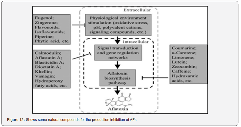 Some authors have previously reported on the use of natural extracts and essential oils for the decrease or degradation of AFs, especially in vitro, in different ways, like inhibiting the growth of aflatoxigenic fungi, blocking AF biosynthesis, and removing or degrading AFs [63-65]. Because plant extracts contain a large group of active compounds, as shown in (Figure 13). The most important advantage of using plant extracts to control aflatoxin is that their effect on food quality is limited. However, most of them lack specific mechanisms of action. Therefore, it needs more research to benefit from it on a commercial scale [66]. In this regard, I have conducted a study using the aqueous extract of three leaves of wild edible plants (sow thistle, chicory, and Rajesh), which has proven effective in preventing the synthesis of AFs with percentages of inhibition of AFB1 of 78.03, 68.8, and 81.7%, respectively [67]. Another study by [68] found that using an aqueous extract of carob pulp at 5 mg/mL reduced the production of AFs by 76.5 to 86.5%.