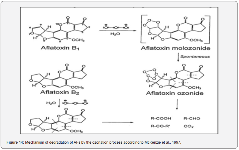 Ozonation has been considered an interesting method for the remediation of cereals contaminated by aflatoxins. The ozone reaction with AFB1 in the site C8-C9 double bond at the terminal furan leads to the formation of aflatoxin molozonide, which is further changed to aflatoxin ozonide. This compound is unstable and changes to aldehydes, ketones, acids, and CO2 (Figure 14). Ozone decomposes to form oxygen gas and therefore can be classified as a nonpersistent chemical; however, it must be generated at the location of its intended use (McKenzie et al., 1997). On the other hand, these features make ozone an important alternative for the food industry. Finally, many international organizations, including the WHO, FAO), and FDA, had regarded ozone as a safe and effective chemical applied in the food industry. A few factore, including temperature, moisture content, exposure time, and O3 concentration, which effected on effectiveness of ozonation process on aflatoxins. A few factors, including temperature, moisture content, exposure time, and O3 concentration, affect the degradation of aflatoxins by ozone [69,70]. In my opinion, it is one of the most effective ways to reduce aflatoxins. It also has ease of application in gaseous as well as liquid forms, no residue after contact, no hazardous disposal, and easy on-site generation of ozone [71].