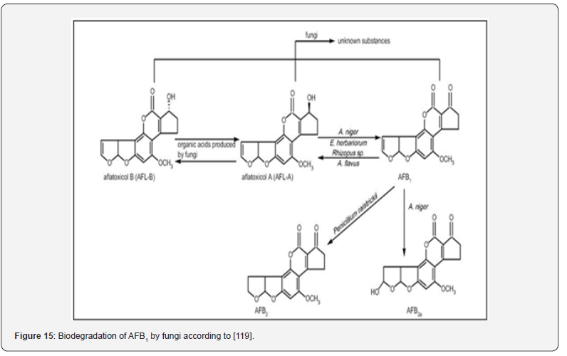 There are many antagonistic microbes that can be used for this purpose, such as several bacterial species, nontoxigenic fungi, and trichoderma. The biological techniques are based on competitive exclusivity or biological interactions like antibiosis. Biodegradation for AFB1 may work through catabolic pathways to detoxify the AFs into less toxic intermediates or final products. Such as, microbe is able to convert AFB1 to aflatoxicol by reducing the cyclopentenone carbonyl of AFB1. These fungi could convert AFB1 to aflatoxicol-A, and then aflatoxicol-A was converted to aflatoxicol-B by the actions of medium components or organic acids produced from the fungi (Figure 15).