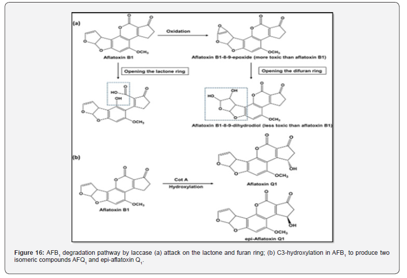 Recently, many reports on the isolation, identification, and purification of AFs-degrading enzymes from microorganisms have increased significantly. To avoid defects resulting from the use of whole organisms for biodegradation for AFs, the use of enzymes is far more convenient since they are substrate-specific, effective, and environmentally friendly; moreover, their application in the food and feed industries has been established [79]. The enzymatic degradation of AFs depends on a number of factors, including temperature, incubation time, enzyme concentration, and initial AFs concentration [80]. Alberts et al. (2009) first proposed the role of laccases that produced and purified from Pleurotus pulmonarius in degradation of AFB1. They reported that enzyme laccase (Lac2) showed AFB1 degradation up to 90%. According to [81] laccases act on AFB1 in two ways as shown in (Figure 16).