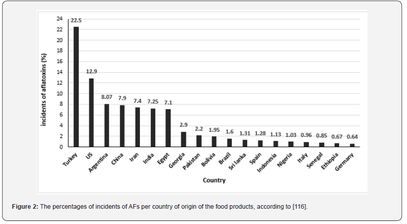 [32] conducted a comprehensive analysis of risk assessments of aflatoxins published between 2016 and 2022. Based on the EU’s Rapid Alert System for Food and Feed (RASFF) data, they came to the conclusion that grains and their products represent the fourth most significant food category contaminated by AFs (3%) from these notifications. Corn and rice have been found to be the main sources of dietary intake from grains for individuals with AF at 2.19% and 0.71%, respectively. It comes in seventh and tenth rank per food category. In this regard, [33] reported that AFs are present in 60–80% of the world’s grain harvests. As well, for RASFF data, 2812 AFs notifications were found in different countries issued within the same period (January 2016 and March 2022), as shown in (Figure 2).