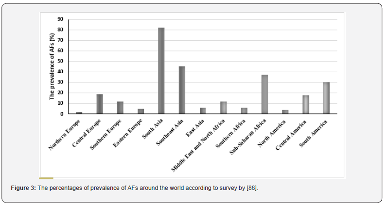According to the data from [34] on the World Mycotoxin Survey, which was conducted on 21287samples from 86 countries, overall, the survey shows that the occurrence of fumonisins and deoxynivalenol remains high on every continent. Although the prevalence of mycotoxins is shifting, “due to climate change, mycotoxins, which were usually found in the southern part of the world, are now moving to the north. Mycotoxins are moving with the shifting climate,” said Annelies Mueller, product manager at Biomin. (Figure 3) shown the rate of the prevalence of AFs in some geographical areas in world.