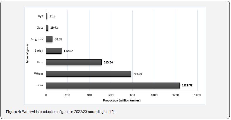 The production of grains increased by 64 million tonnes, or 2.1%, globally between 2020 and 2021, mostly because of a 4.1% increase in corn. Corn, wheat, and rice accounted for 90% of the total amount of grains produced in 2021. Corn, wheat, rice, barley, and sorghum are the five most produced species of grains (Figure 4). Corn showed the highest production (1.235 billion metric tons in 2023), followed by wheat (784.91 million metric tons) and rice (513.55 million metric tons). Concerning Egypt, according to CAPMAS (2022), the amount of production of corn, wheat, and rice was 7.2, 9.8, and 4.4 million metric tons, respectively. On the other hand, sorghum and barley recorded 750 and 90 metric tons, respectively [35]. The global production of corn produced by the United States and Brazil was 39%. Almost 23 percent of production was from China, making it the second-largest producer. Asia ranked first in the world for rice production, with the top three producers following China, India, and Bangladesh with percentages of 27, 25, and 7%, respectively. The total production of wheat in the world is centered in China (18% of the world total) and India (14%). The Russian Federation was the third-largest wheat producer, accounting for 10% of global production.