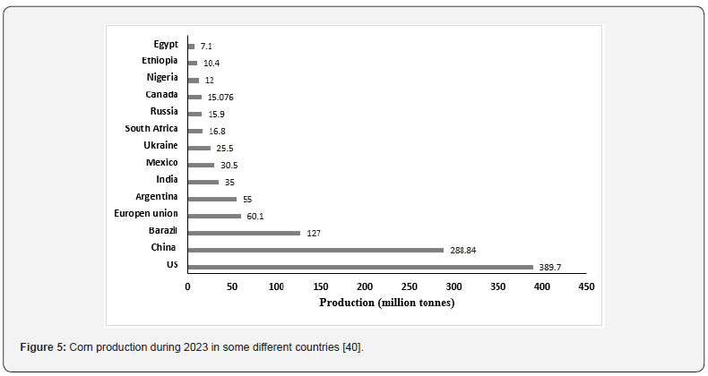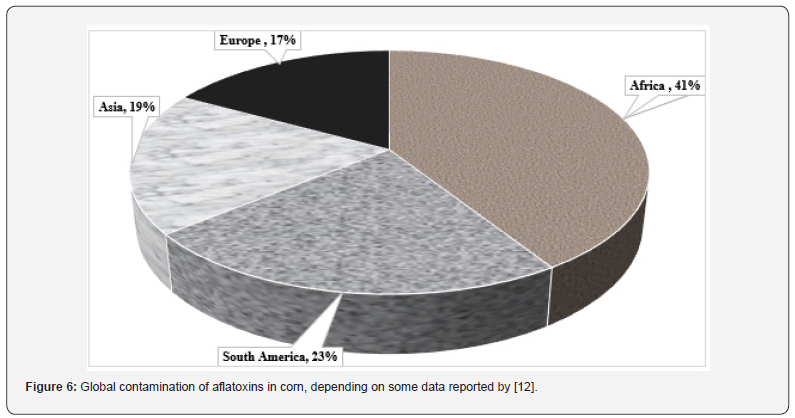 Corn is one of the most important crops in the world that are currently stored for animal feed and human consumption. According to the (IGC) International [36], the leading exporters of corn in the world are the US, Brazil, and Argentina by 369, 113, and 57 million tons, respectively, which are main producers of corn [36]. On the other hand, (Figure 5) displays the global corn production in 2023 as reported by [35]. The occurrence of AFs in corn can start before harvest, during harvest, and postharvest during storage when conditions are favorable for aflatoxigenic fungi for the growth and production of AFs [33]. AFs levels in corn grain vary from year to year but are typically highest in heatand drought-stressed years [37]. Consequently, AFs production may also alter periodically and significantly at a given location. According to [38], hot and dry weather patterns with drought episodes proved favorable for higher AFB1 contamination. (Figure 6) shows the percentage of AFs contamination of corn on the world’s continents. Over the past five years, numerous investigations have detected AFs in corn and its derivatives. According to data published by [12], more than 76% of total AFs were detected, followed by 20% of AFB1 and the remaining AFB2. The concentrations for total AFs ranged between 0.01 and 3760 μg/kg and AFB1 0.15–2072 μg/kg. Many studies have documented the contamination of corn by AFs. (Table 3) in this review displays the total AFs and AFB1 natural occurrences in samples from Egypt, as well as the biggest country produced for corn.