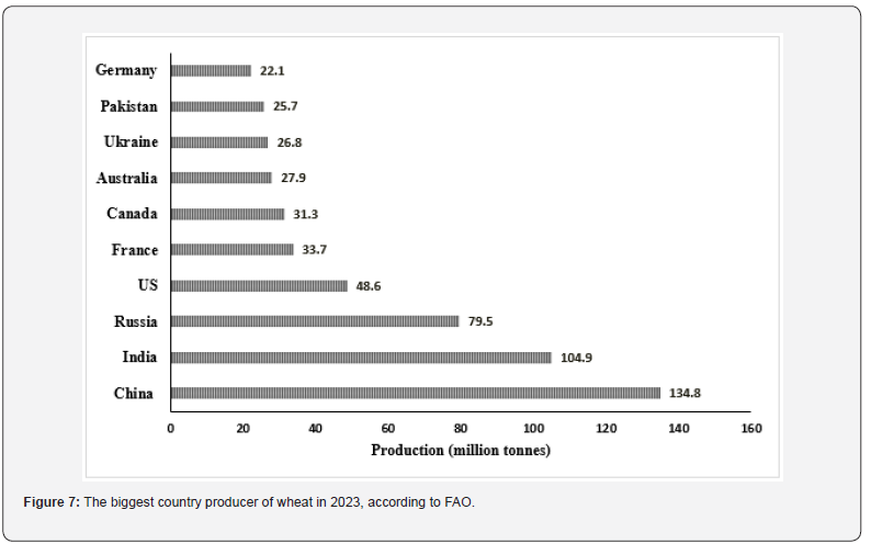 Wheat is an economic and important grain that supplies a fifth of global food calories and protein. It is one of the main staple foods in developing countries. Egypt has one of the highest wheat per capita consumption levels in the world (156.1 kg/person/ year). Egypt is eighth in the world in wheat consumption at a rate of 20.6 million tons annually, while the total production of wheat in Egypt was 9.1 million tons harvested from 3.2 million Feddan [39,40]. On the other hand, the top 10 wheat-producing countries in the world are display in (Figure 7). As shown in (Table 4), a number of studies have documented the presence of AFs in wheat. [28] reports that AFB1 found in 23% of 74,821 samples of wheat collected from 100 different countries worldwide and that the average concentration of infected samples was rising in samples taken from East Asia.