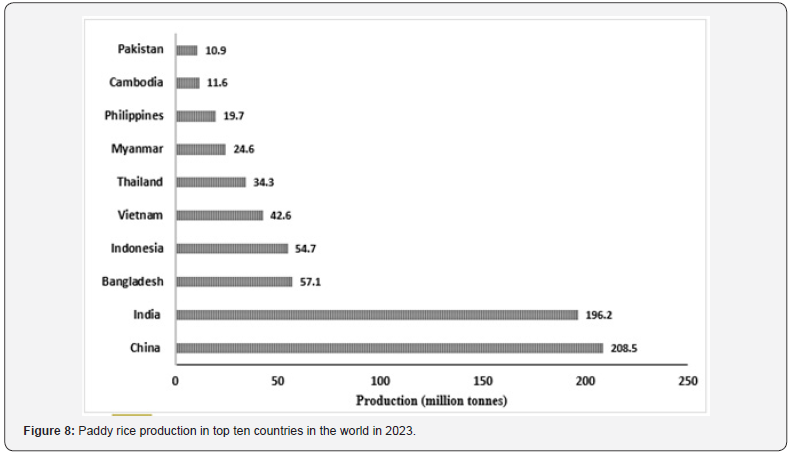 Asia is the primary region for the cultivation and consumption of rice. Rice ranks third in the world after corn and wheat. As (Figure 8) illustrates, China and India are the world’s top producers. In Africa, rice is mainly produced in Egypt and Nigeria. Fungi that produce AFs can contaminate rice during harvest, handling, and storage, as well as when the field’s climate becomes conducive to their growth. Several studies have reported the presence of AFs in rice, which are highly prevalent in Asian nations. The significant frequency of AFs contamination in rice and rice-derived products highlights the significance of close observation of this staple food around the globe [41,42]. AFs prevalence in rice worldwide is displayed in (Table 5). According to [12], the number of AFs present in rice during the 2015–2020 period (with concentrations ranging from 0.014 to 921.93 μg/kg) accounts for 65% of the total aflatoxins. AFB1 and AFB2 make up 35%, with concentrations between 0.014 and 44.10 μg/kg.