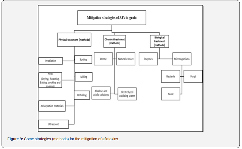 AFs can be found in all stages of grain production, from preharvest to processing, going through a harvest, and post-harvest stages; each stage has appropriate methods and strategies to mitigate and/or remove AFs. In the stage of pre-harvest, methods for controlling aflatoxins are largely preventive, like farming resistant varieties, reducing plant stress, proper fertilization, insect and weed control with the use of fungicides, and timely harvesting, as well as avoiding mechanical damage to the grain and rapid drying. However, this part will focus on the methods and strategies applied in the post-harvest stage, which includes the storage stage too. Strategies for mitigating or controlling aflatoxin in cereals are a viable means of ensuring that customers will receive safe and wholesome food because they prevent contamination of raw materials and processed goods [9]. (Figure 9) summarizes the various innovative strategies for the control of AFs in grain.