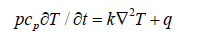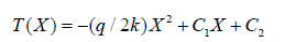 where ρ is the fluid density, cₚ is the specific heat capacity, k is the thermal conductivity of the chip material, and q̇ is the volumetric heat generation rate from the heater plates. Under steady-state conditions and for one-dimensional heat conduction along the channel length, the energy equation simplifies to: k d²T/ dx² + q̇ = 0. The general solution yields the parabolic temperature profile: