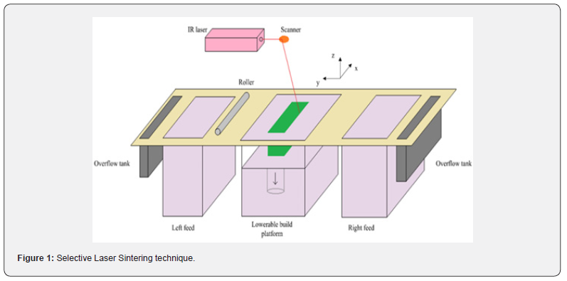 Selective laser sintering was developed several decades ago, more precisely in the late 1980s at the College of Texas at Austin, and later commercialized in the early 1990s. It is a layer-based process in which the 3D object is built using a laser beam that selectively passes over a predefined area on the powder layer shown in Figure 1. The process repeats cyclically, the laser beam melts the powder, it can initiate the crystallization of the polymer structure that binds the material together into a solid structure, and when the next layer of colder powder is applied, it builds up to the geometry of the final product.