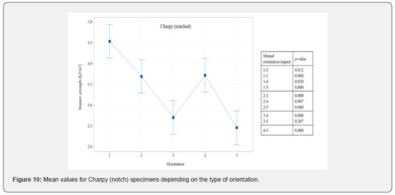 The analysis was based on determining the influence of all orientations on a single mechanical parameter. Due to the amount of experimental data obtained, the influence of the orientation that has the greatest influence on the stated parameter is shown below. In each of the following figures, the orientations are shown on the x-axis as a function of the averaged mechanical parameter shown on the y-axis. To determine the influence of orientation on a mechanical variable, a one-way ANOVA was analyzed with a null hypothesis that all means are equal, with the significance level set at α = 0.05. This means that it can be asserted with a probability of 95% that the stated interval surrounds the calculated mean for the given orientation. To assess whether the values are the same in terms of orientation, a p-value was specified. For the notched impact strength properties determined by the (unnotched) Charpy test, the influence of the orientations on the notched impact strength could not be determined, as the samples oriented with 1 and 2 are not fractured.