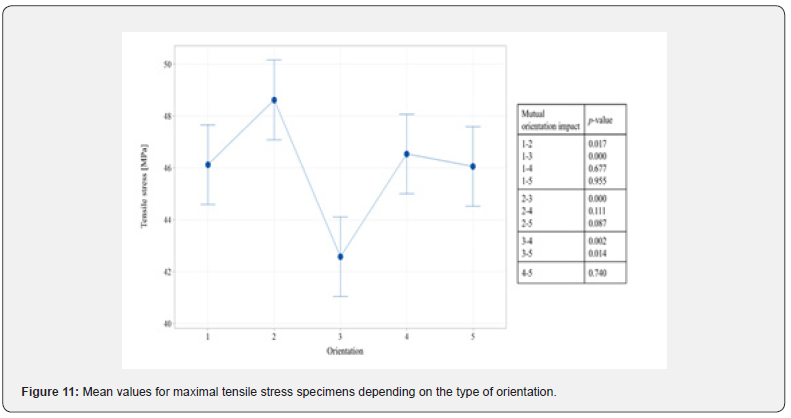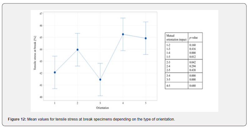 Figure 11 shows that the effects on the maximum tensile stress of the samples are the same when considering orientations numbered 1, 4, and 5, as evidenced by the p-value of more than 0.05. It can be seen that orientation 2 has the greater influence on the maximum tensile stress of the specimens, in contrast to the evaluation of the influence of the orientations on the Charpy notched impact strength, which is achieved at orientation 1, where the specimen is positioned 90 degrees to the most natural position of orientation 2. The lowest measured maximum tensile stress occurred in the specimens oriented with orientation 3. The fabrication process of the specimens with orientation 3 was performed perpendicular to the function of force in the uniaxial tensile test, which is as expected.