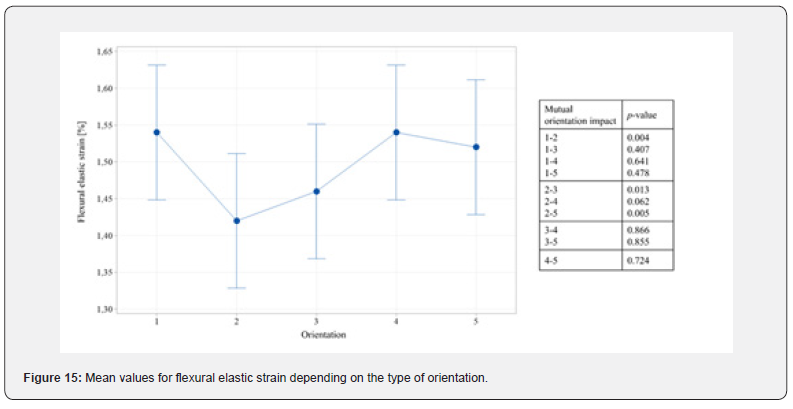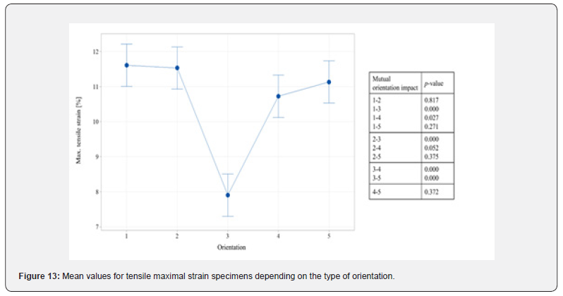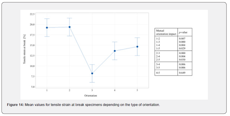 Figure 13 shows the maximum elongation of the specimens, expressed in %, at the specified orientations. Orientations 1, 2, and 5 are statistically supported by the p-values based on the probability mean. Orientation 3 proved to be less favorable with regard to the lowest elongation of the samples. For the other mean values, it is shown that they lie within the defined interval limits with a probability of 95 %, which means that they are the same or slightly close to each other, which defines an insignificant influence between the other four orientations in the measurements of the elongations of the samples.