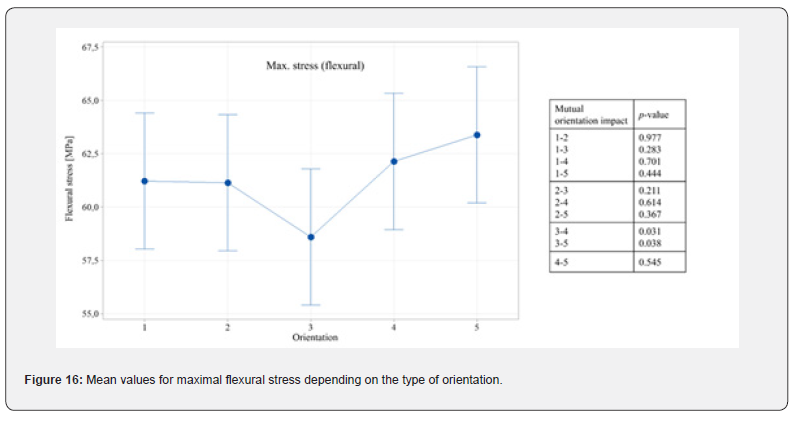 Figure 15 shows the mean values for the bending elastic strain as a function of the different orientations. Figure 15 also shows the corresponding mean values for the maximum bending stress as a function of the selected orientations (Figure 16). Looking at the effects of the different orientations on the bending elastic strain shown in Figure 15, it is noticeable that most of the mean values fall in the predicted intervals where there is statistically no difference between them. Looking at the trend shown in Figure 15 and Figure 16, it can be seen that the amplitude of the bending stress is inversely proportional to the bending elastic strain, which can possibly be related to the thesis that the strength is inversely proportional to the impact strength of the material.