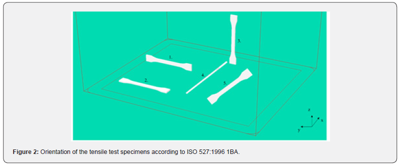 SLS sPro 60 machine was used to carry out two basic studies. In the first study, the effects of basic input parameters such as laser power and scan distance on the impact, tensile and flexural properties. of PA12 powder were investigated and evaluated. The test specimen was manufactured according to ISO 527:2012. Figure 1 shows different investigated orientations of the specimen.