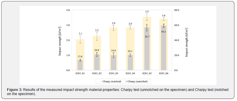 Figure 3 shows the measured values for the notched impact strength of samples obtained using two different test methods. The grey column shows the results obtained with the Charpy standard test on unnotched samples. The yellow column shows the results of the Charpy test with a notch on the samples. Significantly, samples 0245_05 and 0245_6 express the highest impact strength. Concerning Table 1, this means that the notched impact strength is significantly influenced by the scan distance.