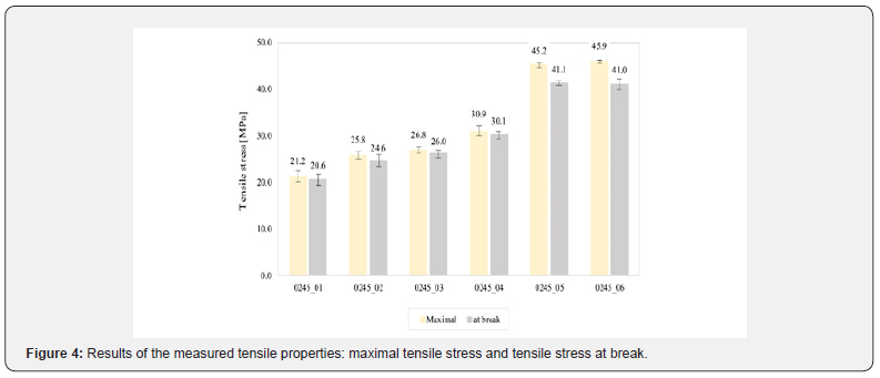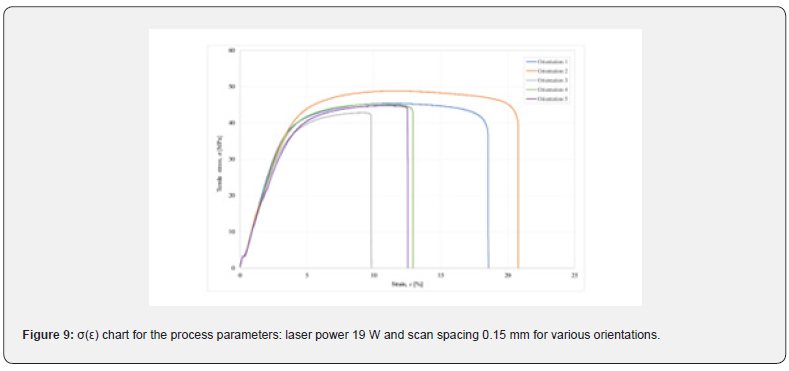 In this section, the effect of different orientations of the manufactured test specimens was determined and analyzed with the combination of process parameters under the number 0245_06, which was irradiated with a laser power of 19 W and a scan distance of 0.15 mm. Figure 9 shows an example of the results for one of ten tests carried out for each orientation of sample production. Figure 9 shows that orientation 2 has the greatest influence on the highest tensile stress at the break of the 3D fabricated sample. For the specimen with orientation 2, the fabrication process was performed in orthogonal orientation according to the force applied in the uniaxial tensile test. The lowest tensile stress at fracture is achieved in the specimen with orientation 3, in which the force was applied perpendicular to the structural layers in the uniaxial test, which corresponds to the physical process.