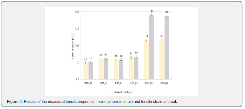 Figure 6 shows the measurements of the elastic bending strain on the first y-axis and the maximum bending stress on the second y-axis of the standard PA12 specimen. Here, too, the measurements on samples 0245_5 and 0245_6 stand out, as they exhibit both the highest bending strain and the highest bending stress on the second y-axis. Similar trends in the magnitude of the bending properties for individual specimens can be seen as in Figure 4, which describes the tensile measurements of the specimens.
