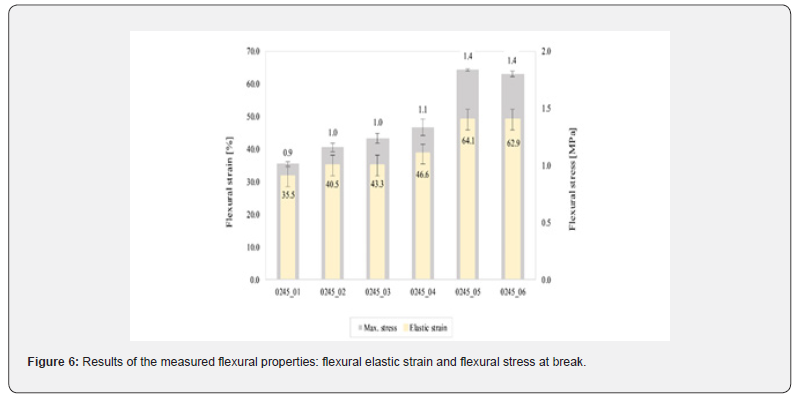 Figures 3, 4, 5 & 6 show the results of the mechanical characterizations carried out as part of the research work. The columns show the average values for each mechanical property measured, calculated considering 10 replicates for each mechanical parameter. For each calculated average value for the selected mechanical property, the standard deviation interval is indicated in each column.