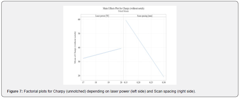 Figure 7 shows factorial diagrams of the test results obtained with the Charpy standard test (unnotched) as a function of the laser power on the left-hand side and on the right-hand side as a function of the scan distance. The model was fitted using experimental data with 99 % in the interval from 17 to 20 W for the laser power and from 0.15 to 0.30 mm for the scan distance. A significant difference was found between the two fitted mean lines, especially in terms of slope. When looking at the fitted mean lines for scan distance compared to the fitted mean lines for laser power, a significant slope is observed. This is confirmed by the p-value, which is 0, in contrast to the laser power with p = 0.059.