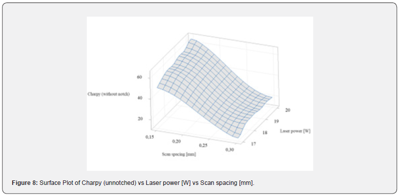 Figure 8 shows a surface plot for the observed dependence between laser power and scan distance in correlation with the measured output obtained by the Charpy test, where the samples were tested without notch at a temperature of 177°C. When considering the influence of the scan distance, a significant influence of the mentioned process parameter on the notched impact strength of the material can be determined. The impact strength changes gradually with decreasing scan distance, which indicates good packing of the powder particles. The distribution has a slightly lower dependence on the scan distance at its ends. This means that the maximum notched impact strength of the material is achieved at a scan distance of 0.15 mm and a laser power of 19 W./