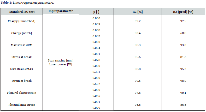 Figure 4 shows the measured values for the tensile properties, in particular the maximum tensile stress column and the tensile stress at the break of the PA12 standard specimen. From Figure 4 it is not possible to precisely determine the correlation between the laser power, the scan distance, and the measured mechanical properties. The explained correlation is shown in the following description of the regression model created in Mini Tab and a corresponding analysis of variance is presented later in the chapter. The results show a trend towards better mechanical tensile stress (maximum and at break) for samples 0245_5 and 0245_6.