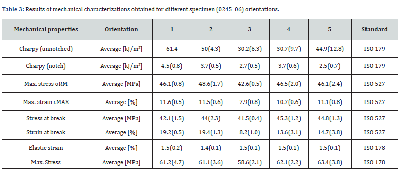 Based on the measured mechanical properties of the samples that withstand the highest loads, the influence of the different manufacturing orientations was investigated. The results showed that the orientation of the test specimens parallel to the building platform (Figure 2: orientation 2 - planar) and rotated by 90 degrees (orientation 1 - edge) compared to the first orientation have given the highest impact strength mean values as well as higher elongations of the samples which describe to the maximum toughness of the samples.