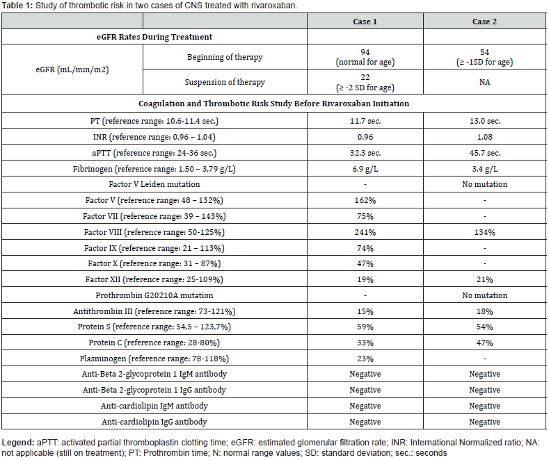 A comprehensive thromboembolic risk assessment was carried out for both patients, revealing only the abnormal findings expected in CNS (Table 1). It is also important to highlight that both patients underwent several CVC replacements, increasing their thrombotic risk. Therapeutic doses were started on both cases according to published recommendations for acute venous thromboembolism in children [5]. No new systemic thrombotic events were diagnosed since starting treatment, and no severe haemorrhages or serious adverse effects were observed. This not only supports the efficacy and safety of the drug as previously described [5,6], but also suggests rivaroxaban might be an option in a subgroup of pediatric patients with CNS.