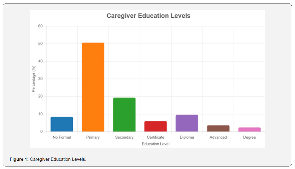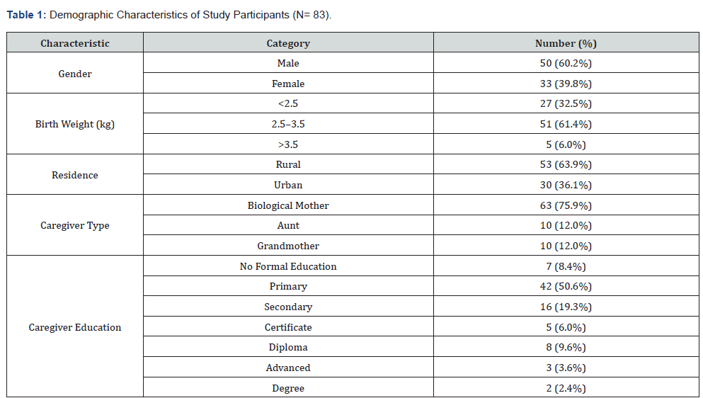 A total of 83 children under five years of age were enrolled in the study. The majority were male (50, 60.2%), with females comprising 33 (39.8%). Most had a birth weight of 2.5–3.5 kg (51, 61.4%), followed by 3.5 kg (5, 6.0%). Participants predominantly resided in rural areas (53, 63.9%) compared to urban areas (30, 36.1%). Caregivers were mainly biological mothers (63, 75.9%), with aunts and grandmothers each at 10 (12.0%). Caregiver education levels were primarily primary (42, 50.6%), followed by secondary (16, 19.3%), diploma (8, 9.6%), no formal education (7, 8.4%), certificate (5, 6.0%), advanced (3, 3.6%), and degree (2, 2.4%) (Table 1, Figure 1).