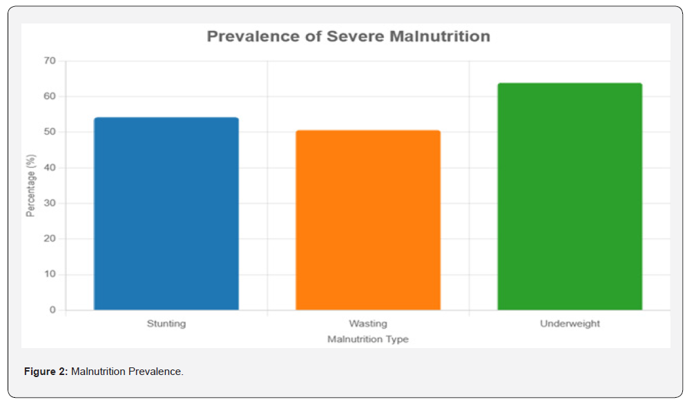 Conclusion: Malnutrition is highly prevalent at TRRH, driven by inadequate breastfeeding, low maternal education, and health challenges. Preterm children and males are particularly vulnerable. Interventions should prioritize maternal education, exclusive breastfeeding promotion, and specialized preterm care to reduce malnutrition.