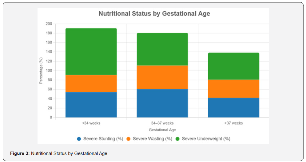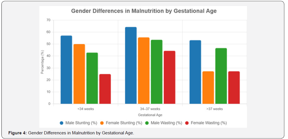 Gestational age distribution showed 46 (55.4%) children born at 34–37 weeks, 26 (31.3%) at >37 weeks (full-term), and 11 (13.3%) at <34 weeks. Severe stunting was most prevalent among children born at 34–37 weeks, while wasting was lowest at <34 weeks. Underweight was widespread, with no children at <34 weeks classified as normal. Males exhibited higher rates of stunting, wasting, and underweight across all gestational age groups compared to females (Table 4, Figures 3 and 4).