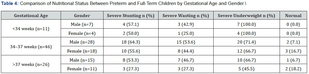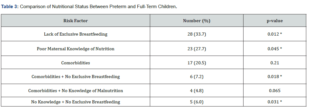 Results: Among 83 children, 63.9% were severely underweight, 54.2% severely stunted, and 50.6% severely wasted. Key risk factors included lack of exclusive breastfeeding (33.7%, p = 0.012), poor maternal nutrition knowledge (27.7%, p = 0.045), and comorbidities (20.5%, p = 0.210). Preterm children (<37 weeks gestation) had higher rates of stunting, wasting, and underweight than full-term peers (p < 0.05). Males were more affected than females, potentially due to higher metabolic demands.