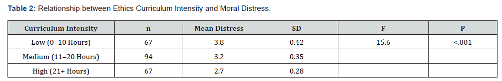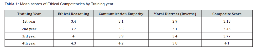 (Table 1) The data demonstrate progressive development of ethical competencies across training years. Pearson correlations revealed a significant relationship between ethical reasoning and communication empathy (r = 0.74, p < 0.001). Trainees with formal ethics coursework reported lower moral distress (r = -0.58, p < 0.01) (Table 2).