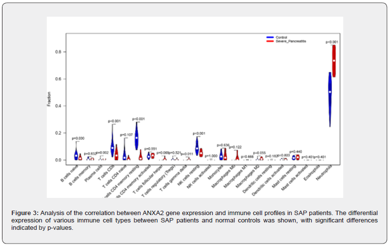 Based on linear support vector regression; the CIBERSORT algorithm [23] deconvolutes the transcriptome expression matrix to estimate the composition and abundance of immune cells in cell mixtures. Data with an immune cell enrichment score > zero were filtered and the specific immune cell infiltration in the matrix of the combined dataset was obtained. The proportion of immune cells was visualized in a bar chart (sup Figure 1 in supplementary material). The different immune cells between healthy controls and SAP patients were shown in plots using the R package ggplot2. Subsequently; the relevance was obtained by the Spearman algorithm and visualized in a correlation scatter plot. Additionally; the Spearman algorithm was utilized to obtain the relevance of immune cells to the focused gene; which was visualized in the violin plot (Figure 3); lollipop plot; and scatter plot (Figure 4 & Figure 5). Our study found that the overlapping gene identified from the combined analysis of GEO data; eQTL_AP; pQTL_UKBB; and pQTL_deCODE was ANXA2. The three miRNAs downregulated in extracellular vesicles from the peripheral blood of SAP patients could target ANXA2. These miRNAs were hsamiR- 378a-3p; hsa-miR-23c; and hsa-miR-4701-5p; with hsa-miR- 4701-5p showing the most significant decrease; with a logFC of -2.52 and an adjusted p-value of 0.035 [24] (Table 2).
