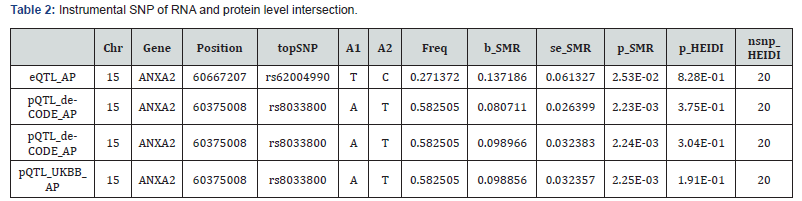 SNPs in the ANXA2 gene (GRCh38 chromosome 15 position 60;347;134-60;402;883 reverse strand) that was associated with gene expression (ie; pQTL) in blood samples were selected based on genome-wide significance (P<5×10−8). To ensure minimal linkage among the IVs used in MR; they were ranked based on the P value of their associations with UKB_PPP_pQTL (https:// registry.opendata.aws/ukbppp/)[10] and subsequently pruned for linkage disequilibrium at an r2 threshold of 0.1 and a distance threshold of 500 kilobases. Considering the correlation between variants; including mildly correlated variants; can improve statistical power over strictly selecting independent variants. MR estimators become unstable when only selecting variants that are highly correlated [11]. The pruning r2 threshold was used to balance these two issues.
