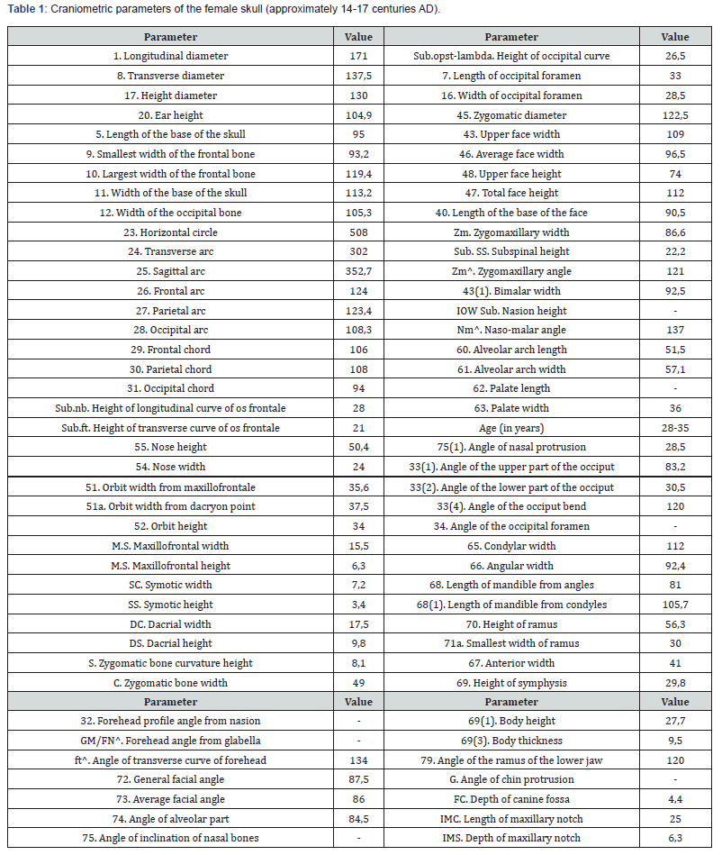 The method of Sh.M. Musayev is based on the results of the analysis of craniometric features of 335 female and male skulls that were discovered on the territory of modern Azerbaijan (in different regions and at different times). Back in the second half of the last century, these craniological objects were quite convincingly attributed by Azerbaijani archaeologists and anthropologists to the period of the 1st -20th centuries AD [13]. Without going into details of the mathematical component of this method, we will only note that it allows us to predict the chronological typicality of the skull using discriminant functions. A set of three discriminant functions allows us to produce a differential classification of four chronological groups: 1) skulls of the 1st -7th centuries; 2) skulls of the 8th-9th centuries; 3) skulls of the 14th -17th centuries; 4) skulls of the 20th century. To implement the appropriate diagnostics, craniometric data from the female skull, which became the object of our study, were necessary. We took all measurements that could be measured based on the preservation of craniometric landmarks. Table cells with a dash correspond to parameters that could not be measured due to various reasons (bone tissue defect, damage, etc.). The results of craniometry of the examined female skull are presented in Table 1.