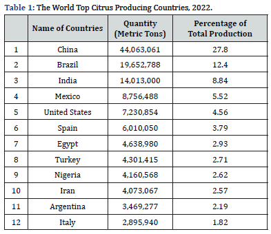 Due to several causes, such as advancements in transportation and packaging, rising affluence, and demand for healthy food, the world’s citrus production has been rising dramatically. For instance, The Global Citrus Statistic Report (WCO) [9] reveals that the world’s total citrus production in 2020 was 158.5 million metric tons (MMT), of which oranges alone accounted for 76 million metric tons (MMT), equivalent to 52.8%. The WCO Report further revealed that China, Brazil, India, and Mexico were amongst the top five producing countries in 2021 (Table 1). Furthermore, although 51% of citrus was produced in Asia, 52% of the total export came from the Mediterranean region [4,9].