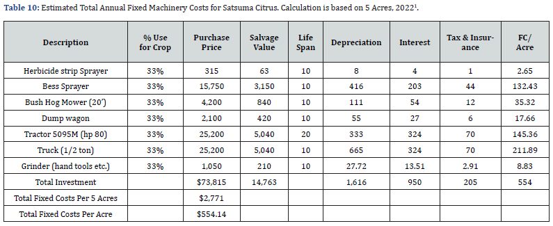 The estimated fixed machinery costs analysis was based on five acres because that was the average farm size for Satsuma citrus growers. Some of the fixed costs items included a tractor, herbicide strip sprayer, bush hog mower, dump wagon, and truck. We also assumed 33% of the use of these equipment because most farmers grow at least three crops on average per season. Even Satsuma growers in the state of Georgia, USA, cultivate other types of citruses at every given time (Table 10). Although the total investment is $73,815, the total fixed cost per five acres per year which is the average farm size is $2,771 while to total fixed cost (TFC) per acre is $554.14 after dividing by five (Table 10).