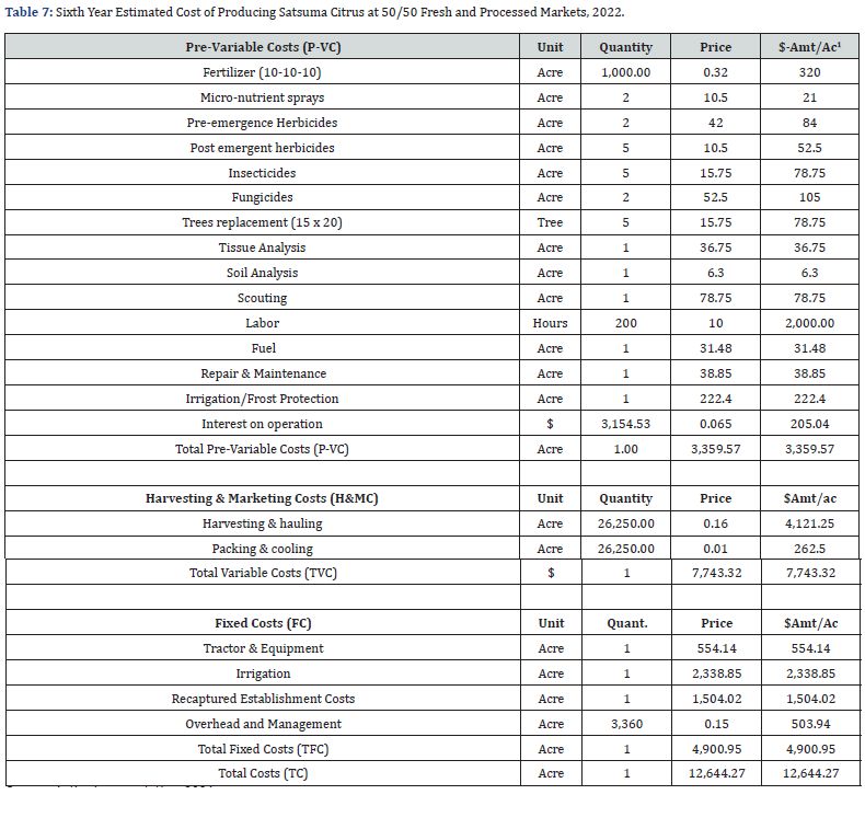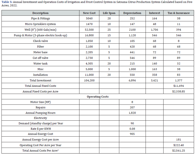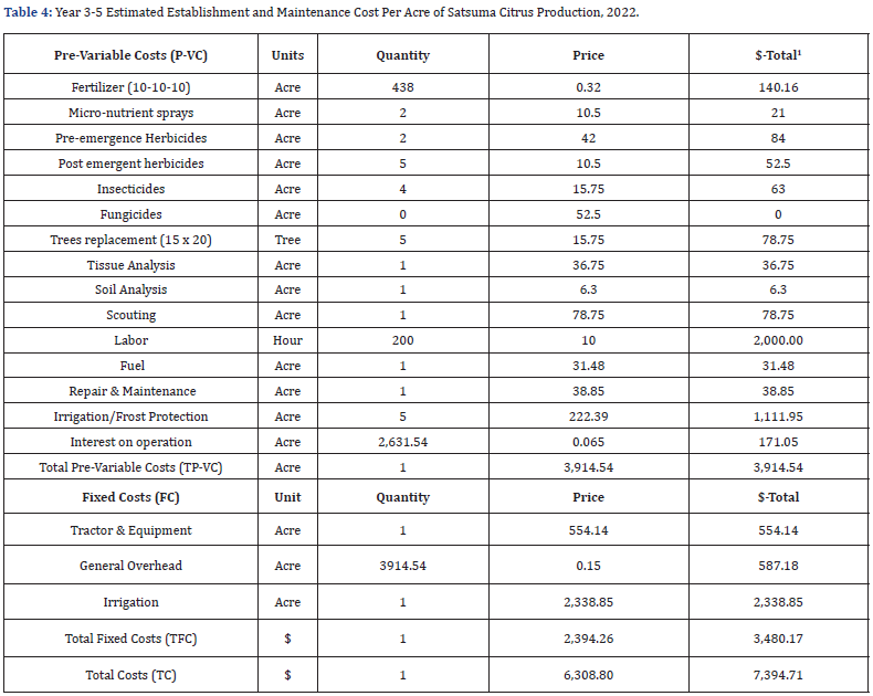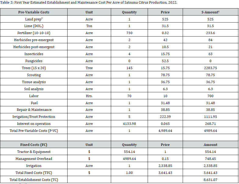 Citrus in general and Satsuma citrus in particular are perennial crops and require at least two years to be established on the field thus requiring major land preparation and maintenance during its first two years. We assumed a citrus field becomes fully productive on and after its 6th year of establishment. Thus, this study estimates the establishment and maintenance costs for the first year, second year and third to fifth year respectively while the 6th is considered full production in this study. The fixed cost (FC) calculation included purchase price, salvage value, the lifespan of the equipment, depreciation, interest rate, taxes, and insurance and was calculated based on five acres because that was the average Satsuma farm size for new entrants [19-21]. Irrigation is an integral part of successful and sustainable Satsuma citrus production. Although several types of irrigation systems are available, this study estimates the costs and returns of citrus production using the drip irrigation system with frost protection measures which require pipe and fittings, tubing, and emitters, a well, pump and motor, and filters.