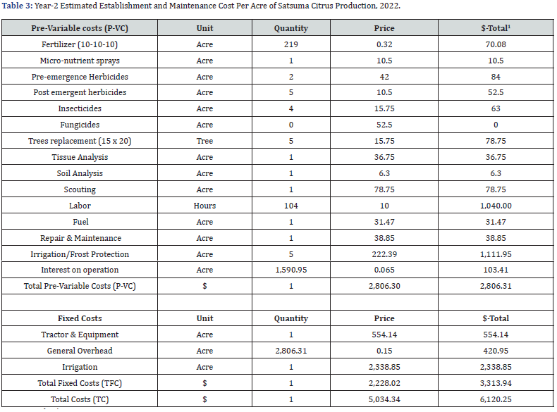 Sustainable production of perennial crops differs from annual crops as the formers do not need to be planted yearly [26]. As with any other horticultural crop, Satsuma citrus requires inputs such as fertilizers, herbicides, insecticides, fungicides, and irrigation, and their effectiveness is critical to sustainable and prosperous production. Table 1 provides the first-year establishment cost of Satsuma citrus production in our study. The establishment costs or total costs (TC) of $8,631.07 per acre is the sum of total pre-variable costs (TP-VC) plus total fixed costs (TFC). Satsuma citrus planting materials, irrigation, and land preparation costs contribute most to the total pre-variable cost (TP-VC). The total fixed costs (TFC) were estimated at $3,641.43 per acre (Table 2).