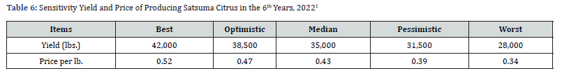 Table 8 shows the sensitivity risk-rated returns over the total costs of producing Satsuma citrus using drip irrigation and frost protection technologies. The sensitivity risk-rated returns analysis is based on the five yield and price scenarios presented (Table 8). The estimated average citrus marketable yield from a fully productive sixth year of production obtained from sampled growers was 35,000 lbs. which is the most likely base yield. The most likely price is $0.43 per pound of citrus during our study period in 2022 was the average price of citrus sold fresh ($0.60 per lb.) and processed ($0.25 per lb.).