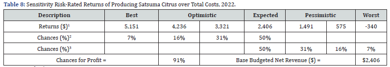 In the best-case scenario, the chance of getting $5,151 per acre in a full production year is 7%, while in the worst-case scenario, there is a 7% chance of losing $340 or less per acre. In the optimistic scenario, there is a 31% chance of gaining $3,321 or more per acre. The table shows that growers can still get a positive net return of $1,491 in the pessimistic scenario, where the chance is 31% of the time. Finally, we observed a 91% chance of positive net returns in a full productive year from Satsuma citrus production using irrigation and frost protection technologies with a net return of $2,406 (Table 8).