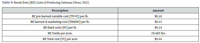 Break-even (BE) analysis is useful in economics, business, and accounting in determining profitability margins for a business enterprise. BE is the point where the business enterprise is neither gaining nor losing money. It is the equilibrium point where the total cost equals the total revenue. For instance, the BE total cost per acre is $0.36, which is the unit cost divided by the medium yield. Therefore, if a Satsuma citrus enterprise’ BE total cost (TC) is more than $0.36 per acre, it will receive a negative investment return, and the reverse is true as well. Similarly, any yields less than the BE yield of 29,405 lbs. per acre would translate to negative net returns and vice versa (Table 9).