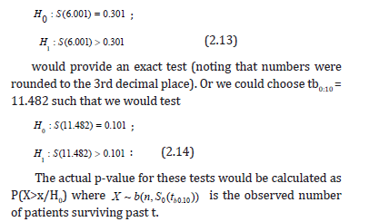 An illustration, let us assume S0(t) at (2.3) is standard exponential (λ= 5) which corresponds to a median survival time of 3.5 (and for illustration, let us say 3.5 months in terms of prescribing a unit of time). A typical test in the phase II cancer setting might be to look at the survival fraction at t =6 months, which in this case yields the hypotheses corresponding to the exact binomial test of