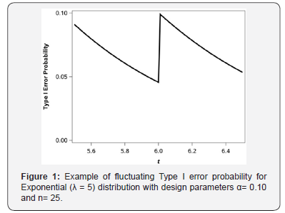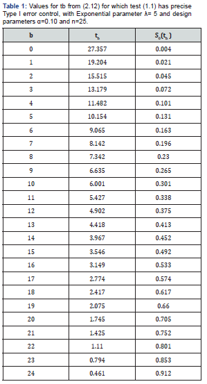 An illustration, let us continue our example from above where we denote S0(t) at (2.3) is standard exponential (λ=5) with n = 25 and = 0.10 then the n values for tb0:10 for each b0.10 = 0,1,2,…,24 are given in Table 1. We could choose any of the values for tb0:10 such that are our desired -level was exactly equal to the true Type I error of the test. For example we could choose tb0.10 = 6.001 such that we would test